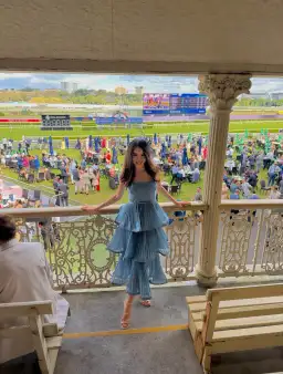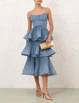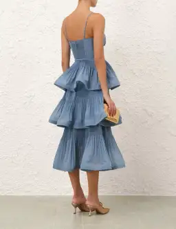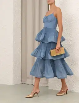 Elegant Zimmermann tiered pleated midi dress in sky blue. Perfect for race days or special events. Professionally dry-cleaned and in excellent condition.