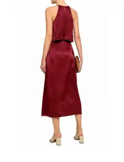 High neck midi dress with shoestring shoulder straps, bodice overlay and splits at skirt