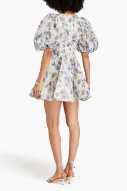 From the Zimmermann Spring 2023 Collection, High Tide. A silk linen organza mini dress featuring elbow length blouson sleeves with elasticated cuffs and panelling throughout, finished with a removable belt.