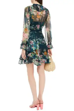 Zimmermann Wavelength Scallop Ruffled Mini Wrap Dress Teal Daphne Floral Size 8