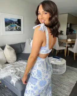The Postcard Tie Shoulder Midi in Blue Tonal Floral from our Resort 2022 Collection, The Postcard. A linen midi dress featuring a scoop neckline, back cut out and self-tie shoulder straps. Linen Fitted bust, relaxed A-line skirt Self tie shoulder straps Hook and eye closure at back bust Invisible zip at centre back skirt Lined Style Code: 3071DPOS