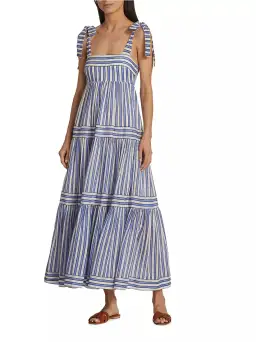 Blue cotton striped tiered maxi dress from Zimmermann featuring a square neck, an elasticated trim and tied shoulder straps.