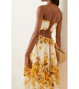The Aliane Scallop Midi Dress in Amber Floral from Zimmermann's Summer Swim 2021 Collection. A linen midi dress featuring waist cut outs, side seam pockets and embroidered scalloped edging throughout.