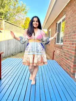 This colourful and gold trim dress makes for a statement attire without much need for accessories.
