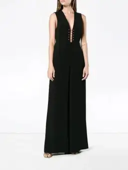 This is the ultimate sophisticated head turner! I never fail to be asked where this jumpsuit is from when worn to events. It features a plunging neckline adorned with gold metal hardware, and in a super comfortable crepe fabric.