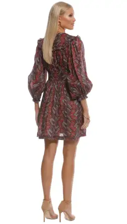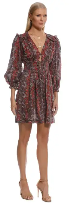 The Zimmermann Bayou Corset Tie Front Dress is a printed mini dress features a plunging neckline with a front corset and blouson sleeves with elasticated cuffs.