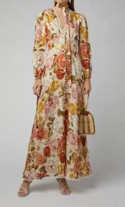 An empire waist maxi dress with soft A-line skirt, blouson sleeves and removable neck tie.