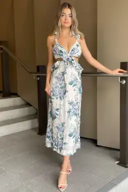 This is a gorgeous floral midi by Zimmermann - perfect for a special occasion or event! This style features waist cut outs, frills throughout and a self tie bow in a beautiful 'hydrangea' printed linen.