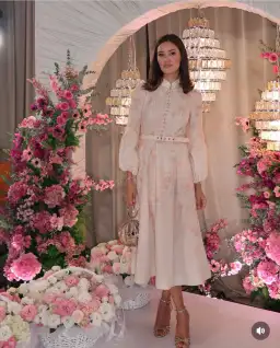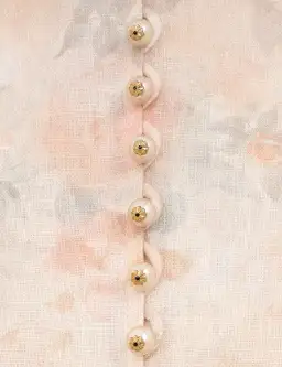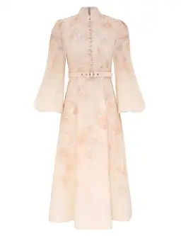The Crush Buttoned Midi Dress in Ciara Floral from our Resort 2025 Collection, Crush. A linen midi dress featuring long blouson sleeves with an elasticated cuff, buttons down the centre front bodice and a removable self covered belt.