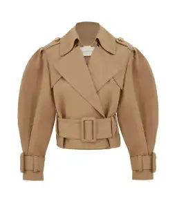 The Crush Cropped Trench Coat in Khaki from our Resort 2025 Collection, Crush. A cropped trench coat featuring a centre front opening with ZIMMERMANN branded buttons, a classic collar with a hook and bar closure; finished with a self cover buckle belt.