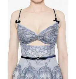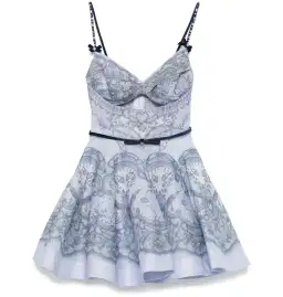The Crush Twist Front Mini Dress in Blue Lace Print from our Resort 2025 Collection, Crush. A silk linen organza mini dress featuring a twisted detailing at the centre bust with a cutout underneath, adjustable velvet straps with crystals and bow detailing and side seam pockets.
