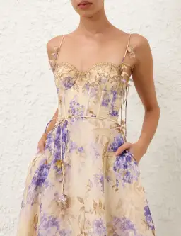 The Dawning Picnic Dress in Lilac Floral from Zimmermann's Spring 2025 Collection, Illumination. A silk linen midi dress featuring a sweetheart neckline with flower details on the straps, finished with corset detailing, a shirred back, and a full flared skirt.