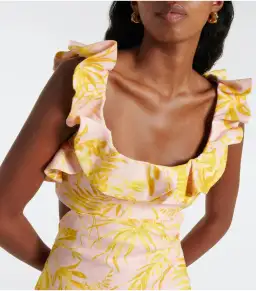 The Golden Ruffle Mini Dress in Pink/Gold Floral from our Summer Swim 2024 Collection. A linen mini dress featuring shoulder and bodice ruffles with a self tie back.