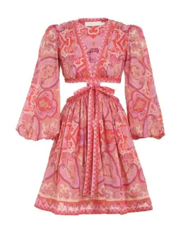 Zimmermann The Halcyon Tie Front Mini Dress in Pink/Purple Paisley