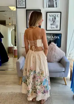 Made of 100% linen, the flattering midi length dress features adjustable back lacing, making it suitable for a range of bust sizes.
