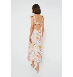 The Harmony Tie Shoulder Midi in Kaleidoscope Garden from our Spring 2024 Collection, Natura. A linen midi dress featuring a square frilled neckline and bow shoulder straps.