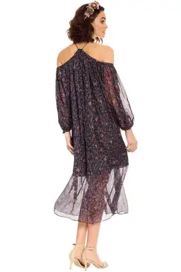 The Zimmermann Havoc Suspend Dress features a gorgeous floral print all over with a glimmering metallic thread woven for a subtle sparkle. With a halter style, off shoulder design and three-quarter length balloon sleeves.
