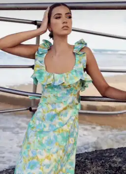 The High Tide Frilled Midi in Aqua Ikat Floral from our Resort 2023 Collection, High Tide. A linen midi dress featuring a square frilled neckline and frill straps, finished with a cutaway back and self tie closure.