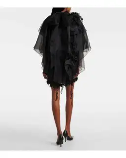 The Hypnotic Applique Mini Dress in Black from our Fall 2025 Collection, Hypnotic. A silk mini dress featuring organza ruffle bodice and floral applique throughout.