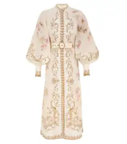 A linen midi dress featuring long blouson sleeves with zippered cuffs, raffia buttons down the centre front and a removable self covered belt.