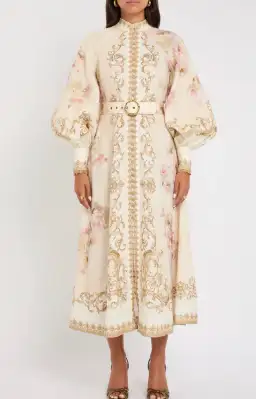 The Hypnotic Buttoned Midi Dress in Cream Peony from our Fall 2025 Collection, Hypnotic. A linen midi dress featuring long blouson sleeves with zippered cuffs, raffia buttons down the centre front and a removable self covered belt.