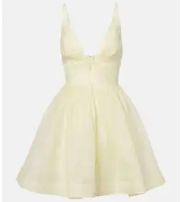 The Illuminate V Neck Mini Dress in Lemon from our Spring 2025 Collection, Illumination. A silk linen mini dress featuring a fitted bodice, a plunging V-neckline and a gathered waist skirt.