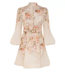 A linen mini dress featuring long blouson sleeves with an elasticated cuff, buttons down the centre front bodice and a removable self cover belt.