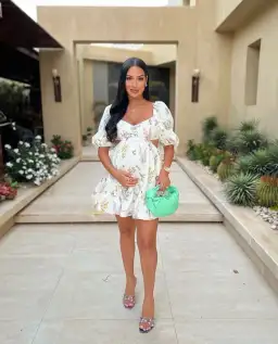A cotton mini dress featuring waist cut outs, a self tie back bodice and short blouson sleeves with elasticated cuffs.