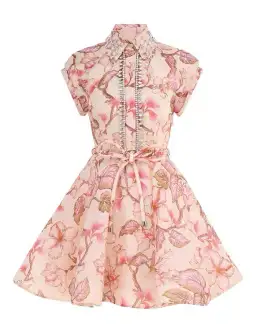 The Matchmaker Flip Dress in Coral Hibiscus from our Resort 2024 Collection, Matchmaker. A silk linen organza mini dress featuring a shirt shaped bodice and full mini skirt, finished with crystal trims throughout.