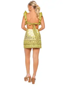 The Matchmaker Frilled Mini in Yellow Bandana from our Resort 2024 Collection, Matchmaker. A linen mini dress featuring a square frilled neckline and frill straps, finished with a cutaway back and self tie closure. Linen mini dress Square neckline with frill detail Boning at bodice side seams Cutaway back with self tie closure Invisible zip closure at centre back