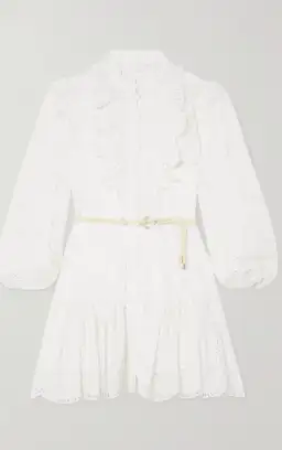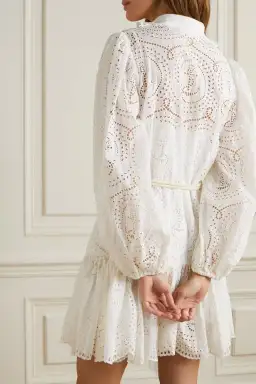 Ivory broderie anglais cotton and silk blend. Button fastenings. Detachable slip. Removable belt.
