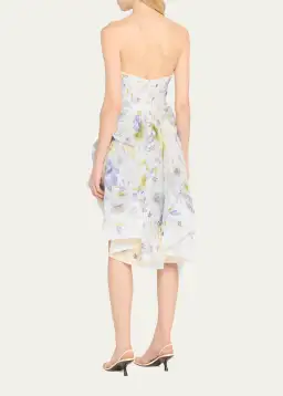 The Natura Draped Mini in Blue Floral from our Spring 2024 Collection, Natura. A silk linen mini dress featuring a structured v-wire bodice and a draped skirt.