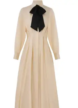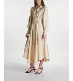 The Natura Draped Shirt Dress in Cream from our Spring 2024 Collection, Natura. A silk midi dress featuring a shirt shaped bodice and full skirt with gathering at the waist.