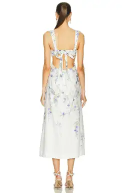 - The SS24 Natura collection by Zimmermann is full of lightweight, botanical designs, much like this dress. Adorned in a beautiful Blue Bird print, it is spun from linen and framed by a sweetheart neckline, while featuring wide straps and boning through the bodice for a structured fit. It boasts an elegantly shirred back with cut-out detailing, before falling to a midi length.