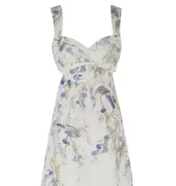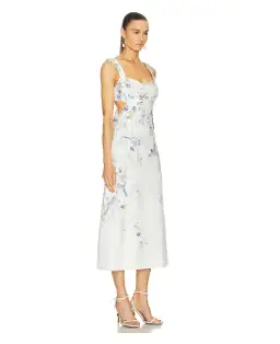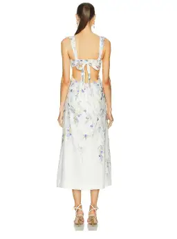 The Natura Midi Dress in Blue Birds from Zimmermann Spring 2024 Collection, Natura. A linen midi dress featuring boning through the fitted bodice, finished with wide straps and a self tie back.