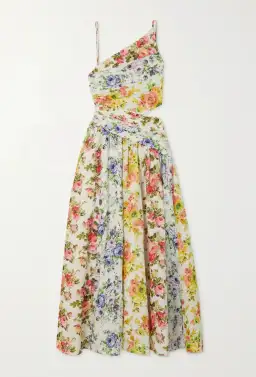 EXCLUSIVE AT NET-A-PORTER. Zimmermann's midi dress is printed with vibrant floral bouquets in an array of colours. Made from naturally breathable organic linen, it's gathered through the asymmetric bodice and has a skin-baring cutout at the waist and back. Wear yours with strappy sandals for summer garden parties.