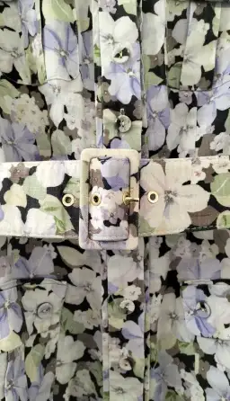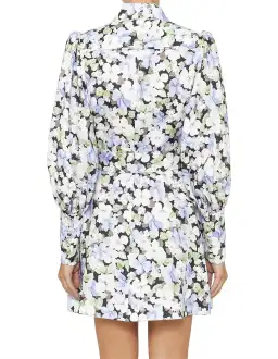 Ninety-Six Shirt Short Dress in a beautiful Pansy print linen mini dress features a tailored bodice with belted waist and exaggerated blouson sleeves.