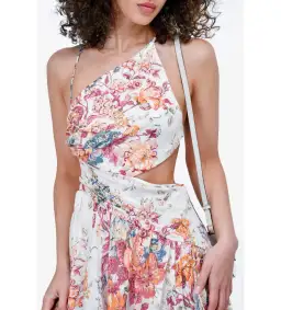 The Pattie Asymmetric dress is from Zimmermann's Resort Swim '22 Collection. This is a charming strappy summer dress with an asymmetric neckline, criss-cross back, gathered skirt and cutout bodice.