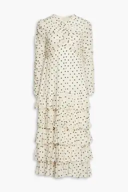 Zimmermann Concert Drawn Midi Dress in Pearl Fall 2021 Collection, In Concert. Size 1/10 AU. RRP $1100. Slim fit. Midi length. Embroidered dot georgette. Ruched bust and sleeves. Frilled tiered skirt. Lined. 100% viscose.