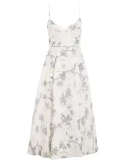 From the Spring 2023 Collection, Wonderland. A linen midi dress featuring a panelled fitted bust, adjustable shoulder straps and shirring at centre back bust.