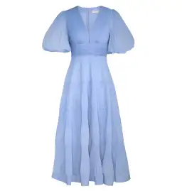 The Pleated Midi Dress in Jacaranda from Zimmermann's Fall 2023 Collection, Luminosity. A midi dress that gathers under the bust and falls to a crinoline inserted hem.