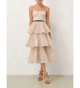 Zimmermann Pleated Tiered Midi Dress in Cream/Black Polka Dot Size 2/AU 12