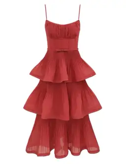 The Pleated Tiered Midi Dress in Rose from our Fall 2025 Collection, Hypnotic. A midi dress featuring a scoop neckline, adjustable shoulder straps, boning within fixed bodice and a heavily pleated tiered skirt.