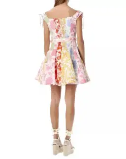 The Postcard Spliced Mini Dress in Spliced Tonal Floral from Zimmermann Resort 2022 Collection, The Postcard. A linen mini dress featuring a tucks through the skirt and off-the-shoulder straps with rouleau ties and pearl ends.