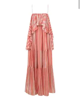 The Rebellion Bohemian Slip Dress in Red Stripe from Cruise 2026 Collection, Twisted Romance. A tiered maxi dress featuring a square neckline, adjustable rouleau self-tie straps, heavy gathering throughout, and finished with a cascading ruffle overlay.