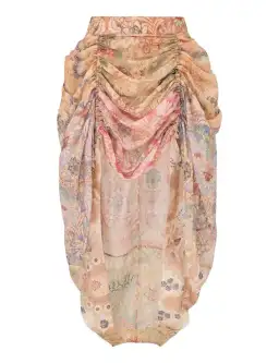 The Rebellion Draped Midi Skirt in Spliced Floral from our Cruise 2026 Collection, Twisted Romance. A silk-linen skirt featuring a fixed waistband, dramatic high-low hem, and heavy ruched detailing, finished with a spliced pattern and invisible zip closure at the back.