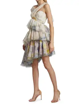 The Rhythmic Asymmetric Mini in Citrus Garden from Zimmermann Spring 2022 Collection, The Dancer. A silk linen organza mini dress featuring a structured bodice with an asymmetric neckline, tiered asymmetric ruffle skirt and lace up panel at centre back.