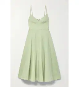 From the Spring 2022 Collection, The Dancer. A linen midi dress featuring a panelled fitted bust, adjustable shoulder straps, and shirring at centre back bust.