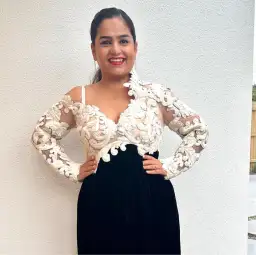 Straight from the Runway, a frock unlike any other. A velvet gown featuring a silk organza bodice with a velvet embroidery motif and velvet skirt.
