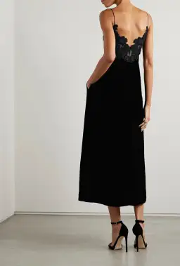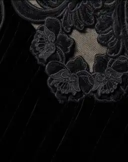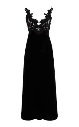 This stunning, ethereal piece from the ZIMMERMANN FW 2023 collection features an elegant black velvet design with intricate lace detailing along the neckline. The plunging V-neck and softly draped silhouette create a flattering and sophisticated look that's perfect for special occasions. The combination of the luxe fabric and delicate embroidery adds a touch of romance to your wardrobe.